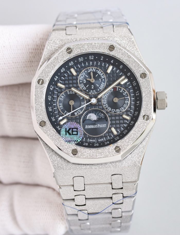 The Audemars Piguet Royal Oak Perpetual Calendar combines luxury with precision, featuring a shimmering stainless steel case and bracelet. Its intricate black dial showcases month, day, and moon phase displays, offering timeless elegance with advanced functionality. Perfect for formal occasions and collectors of fine timepieces.
