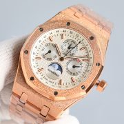 This exquisite Audemars Piguet watch features a stunning rose gold case and bracelet, elegantly complemented by a dark blue dial. The intricate perpetual calendar design offers functionality and sophistication, making it perfect for both formal and business settings. Crafted with precision, this timepiece showcases the brand’s dedication to luxury and quality.