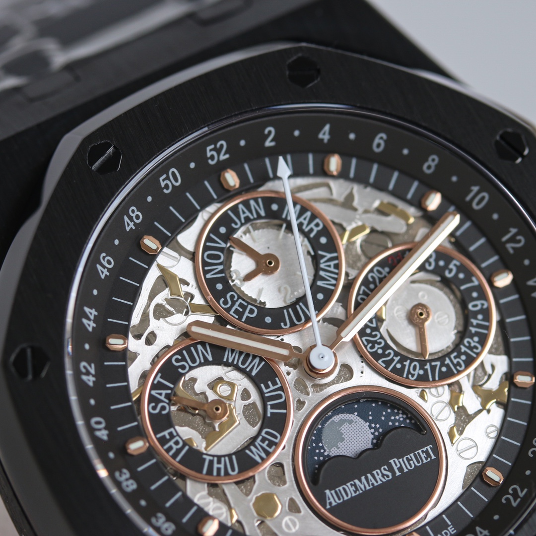 Discover the Audemars Piguet Royal Oak Perpetual Calendar, a masterpiece of luxury and precision. Featuring a sleek black ceramic case and bracelet, this watch offers a sophisticated skeleton dial showcasing its intricate movement. Perfect for collectors and connoisseurs, it combines style and functionality with perpetual calendar complications, making it ideal for formal occasions and daily elegance.