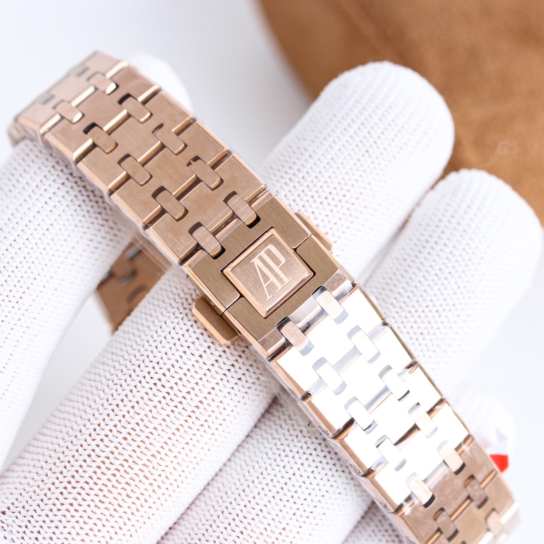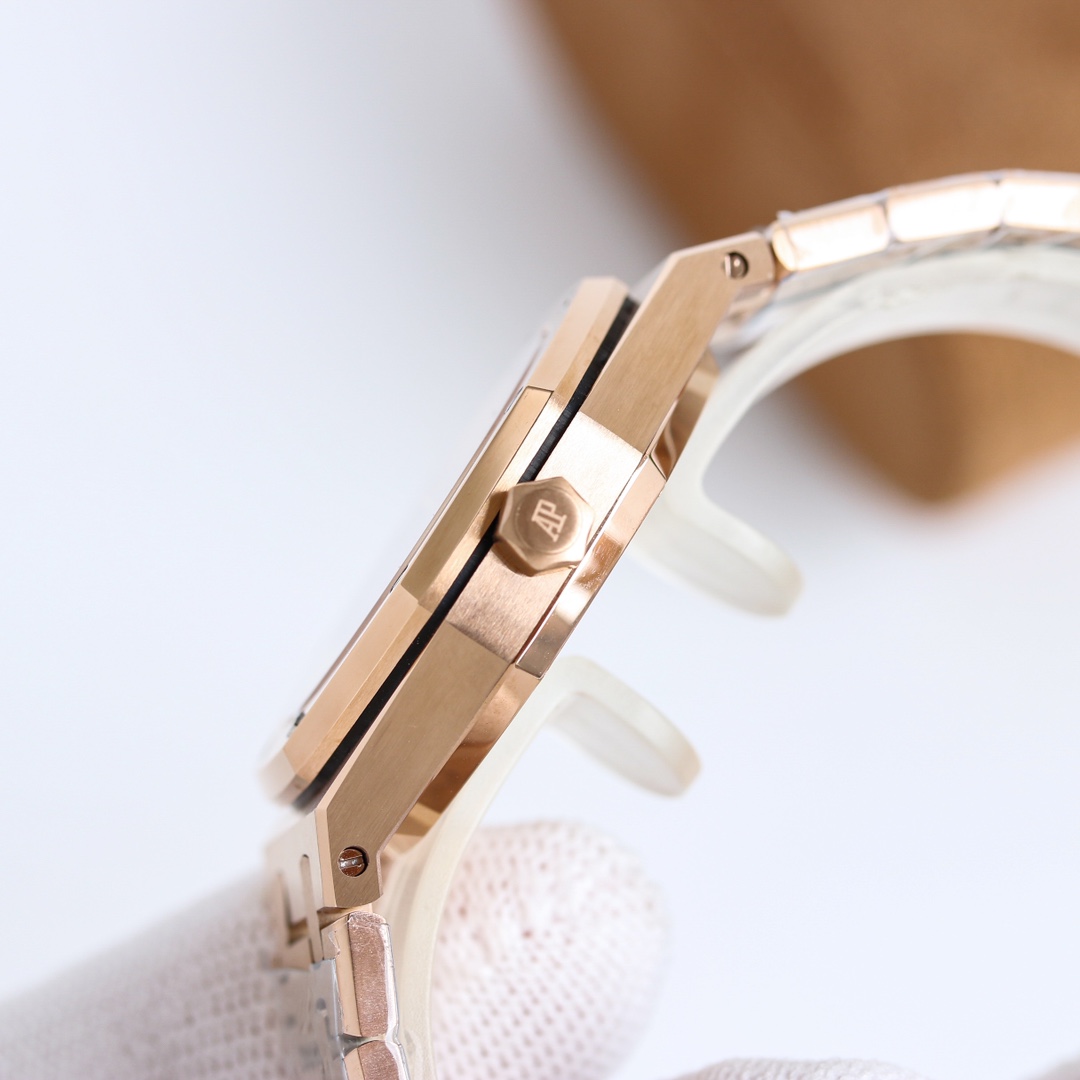 The Audemars Piguet Royal Oak watch combines luxury and elegance with its iconic pink waffle-pattern dial and rose gold case. Crafted from premium materials, it features a stylish integrated bracelet that ensures both comfort and sophistication. Ideal for discerning individuals, this timepiece is perfect for both formal occasions and everyday wear, reflecting a unique blend of tradition and modernity.