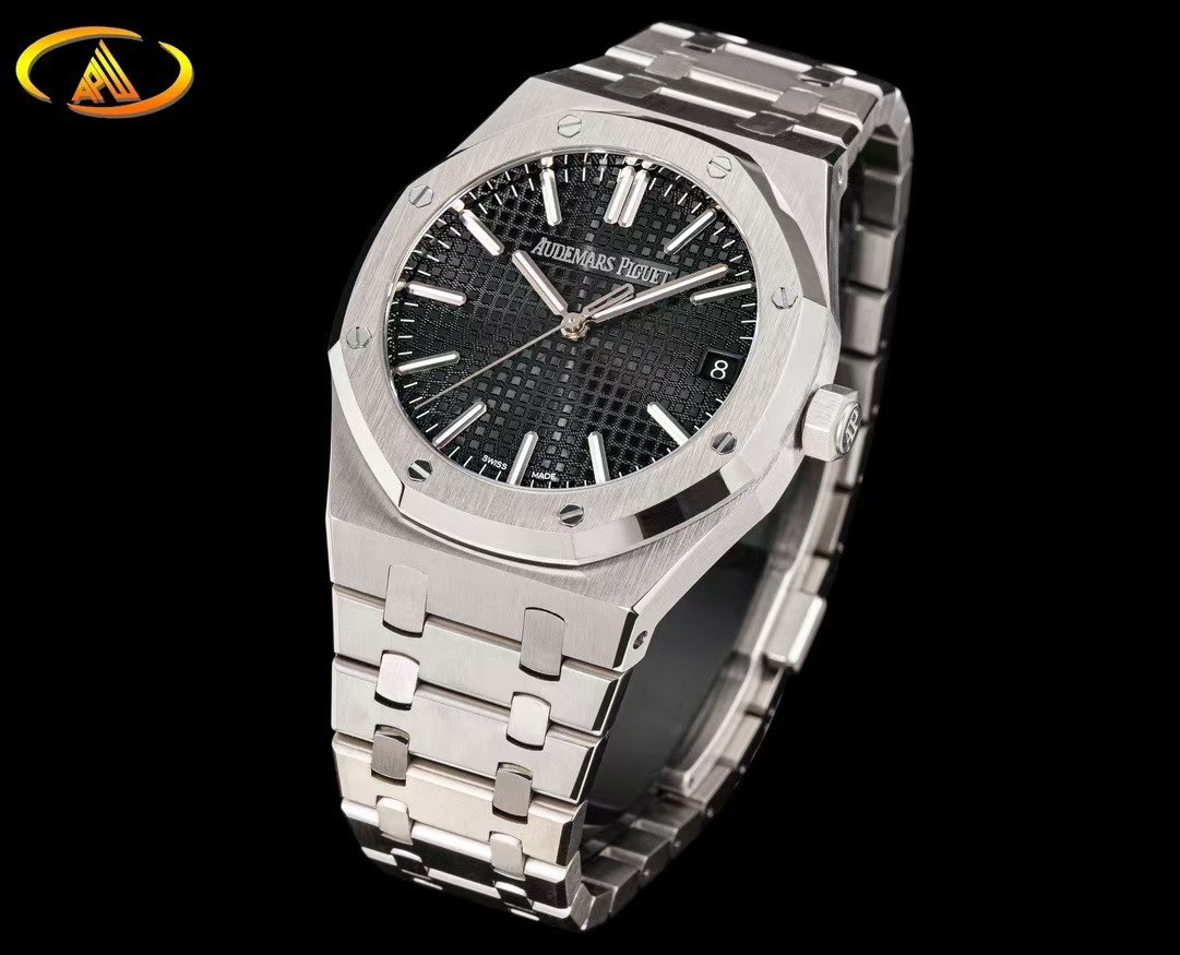 The Audemars Piguet Royal Oak exemplifies timeless elegance with its iconic octagonal stainless steel case and intricate “Tapisserie” patterned black dial. This sophisticated timepiece combines durability with luxury, making it an ideal choice for both formal occasions and everyday wear. The integrated bracelet and precise automatic movement enhance its allure, ensuring style and performance.