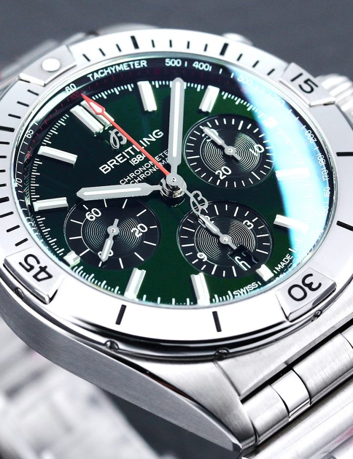 The Breitling Chronomat exudes elegance and functionality with its sleek stainless steel design and striking green dial. Perfect for both professional and casual settings, this timepiece features a chronograph function and tachymeter scale, ensuring precision and style. The robust construction and sophisticated look make it an ideal choice for those who value luxury and performance in their accessories.