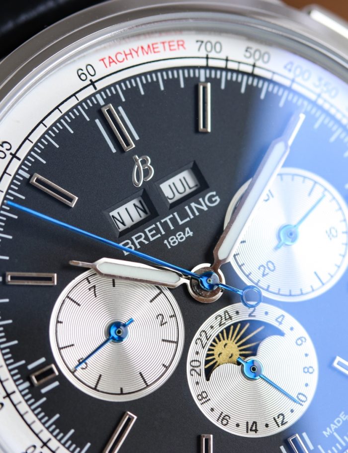 The Breitling Premier B25 Datora 42 combines elegant design with precision craftsmanship. Featuring a polished stainless steel case and a sophisticated black leather strap, this watch is perfect for both formal and casual occasions. The intricate dial displays moon phase and chronograph functions, highlighted by a sleek blue and silver color scheme. Ideal for those who appreciate timeless style and advanced functionality.
