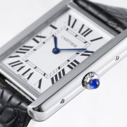 The Cartier Tank Solo exudes timeless elegance with its sleek stainless steel case and classic Roman numeral dial. Paired with a luxurious black leather strap, this watch embodies sophistication and simplicity. Perfect for both formal occasions and everyday wear, it seamlessly blends style and function. The blue sword-shaped hands add a touch of distinctive charm, making it a must-have accessory for those who appreciate understated luxury.