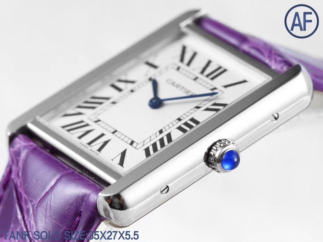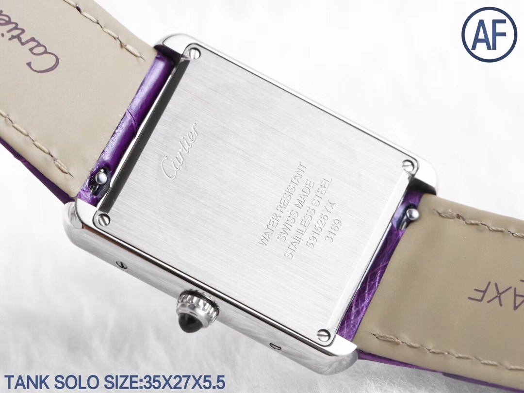 The Cartier Tank Solo watch epitomizes timeless elegance with a striking purple leather strap and sleek stainless steel case. Featuring a classic rectangular face with Roman numeral markers, this watch seamlessly blends sophistication with modern style. Perfect for both formal and casual occasions, the Tank Solo is a versatile accessory that enhances any ensemble. Its quality materials ensure durability and sophistication, making it an essential piece for those who appreciate luxury and craftsmanship.