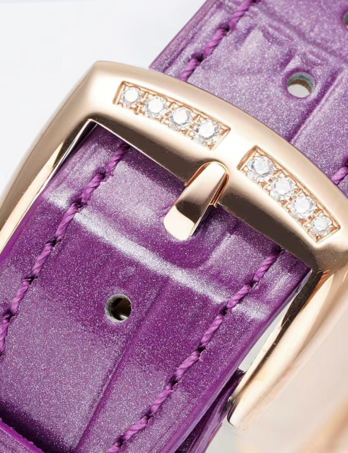 The Franck Muller Long Island Timepiece showcases elegance with its rectangular case adorned with shimmering diamonds. The bold numerals and intricate dial design offer a striking visual, complemented by a luxurious purple leather strap. Crafted with precision, this watch is perfect for those who appreciate timeless sophistication and style, making it an ideal accessory for both formal occasions and fashionable daily wear.