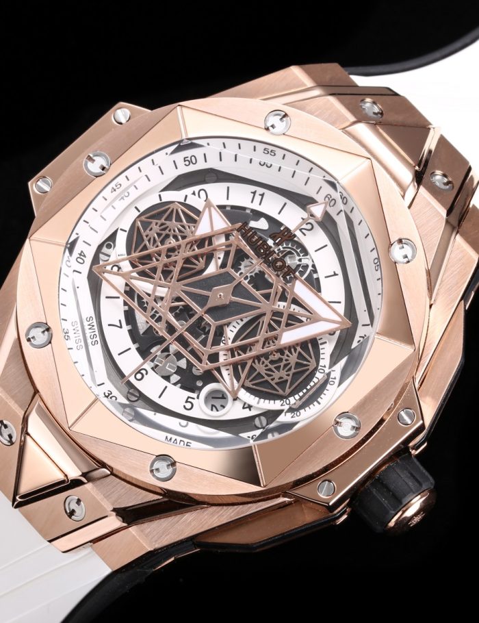 The Hublot Big Bang Sang Bleu II showcases a striking design with a rose gold case and intricate geometric patterns. This luxury timepiece features a bold, multi-layered dial with luminescent hands, enclosed within a robust yet elegant structure. Paired with a comfortable white rubber strap, it offers a sophisticated look for both formal occasions and stylish everyday wear. Crafted with precision, it perfectly combines avant-garde aesthetics with high-performance functionality.