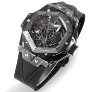 The Hublot Extravagant Black Fusion Watch showcases cutting-edge style with its bold geometric design and intricate dial. Crafted from high-quality materials, this timepiece features a striking black case and a durable rubber strap. Its avant-garde aesthetic makes it perfect for fashion-forward individuals seeking a statement accessory that combines modern luxury with sophisticated craftsmanship. Ideal for both formal and casual settings.