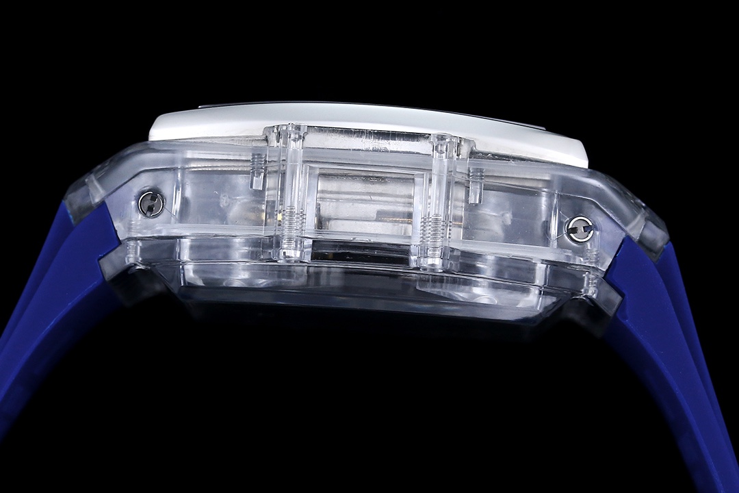 The Hublot Spirit of Big Bang Sapphire Chronograph showcases a striking transparent case with intricate detailing, conveying luxury and innovation. Its blue skeletonized dial, complemented by a sapphire crystal, highlights the watch’s sophisticated mechanics. Designed with a robust blue rubber strap, this timepiece combines comfort and style. Ideal for those who appreciate avant-garde design and high-performance watchmaking, it’s perfect for both formal and casual settings, making a bold fashion statement.