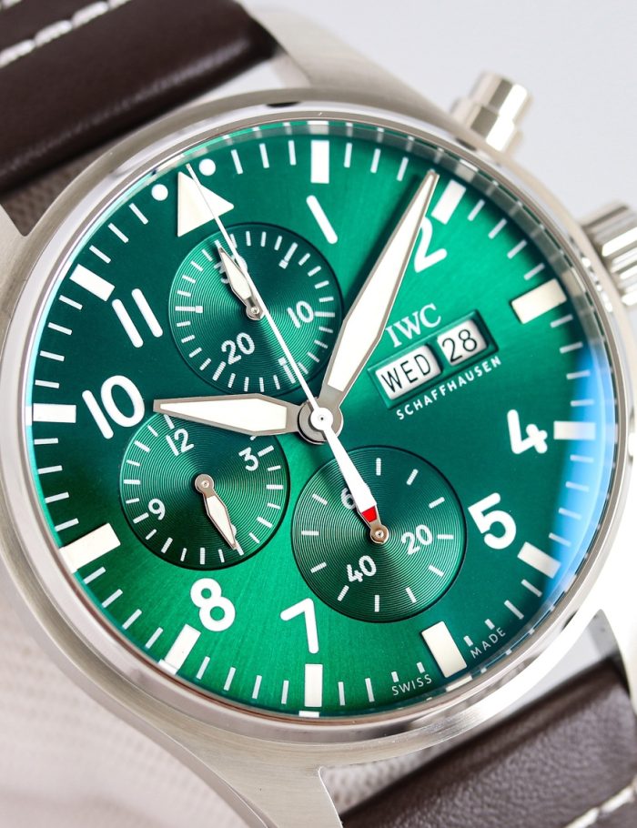 The IWC Pilot Chronograph combines robust functionality with classic elegance. Featuring a striking green dial and three subdials, it offers precise timekeeping and a sophisticated aesthetic. The stainless steel case is paired with a rich brown leather strap, ensuring durability and comfort. Ideal for both professional settings and casual outings, this timepiece embodies timeless style and reliability.