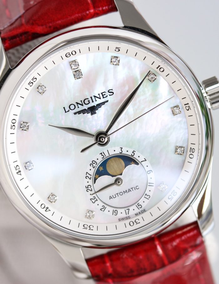 Experience timeless elegance with the Longines Elegance Moonphase Automatic Watch. Featuring a luminous mother-of-pearl dial adorned with diamond indices, this watch combines luxury with functionality. The striking red leather strap adds a bold touch, perfect for both formal occasions and everyday sophistication. Its moonphase complication and automatic movement ensure precision and style, making it a must-have for discerning watch enthusiasts.