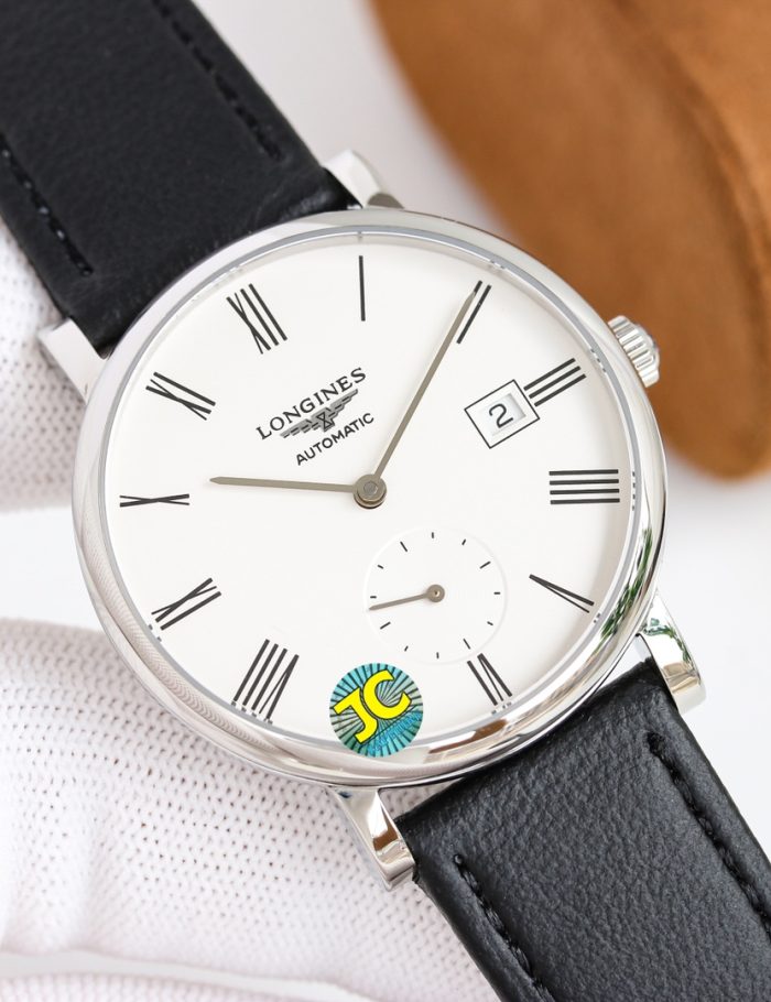The Longines Elegant Automatic Watch exudes sophistication with its sleek stainless steel case and textured white dial set with diamond hour markers. Paired with a refined black leather strap, this timepiece is ideal for formal occasions or professional settings. Its automatic movement ensures precision and reliability, while the date function adds a practical touch. Perfect for those who appreciate timeless style and Swiss craftsmanship.
