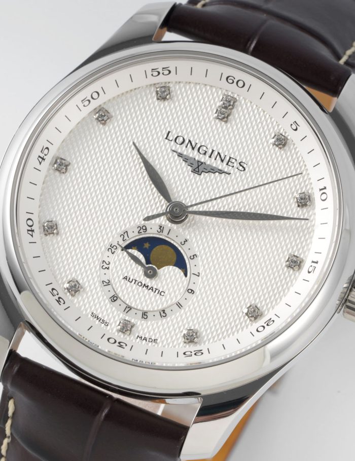 Experience timeless sophistication with the Longines Elegant Moon Phase watch, featuring a sleek stainless steel case and a textured dial adorned with diamond indices. Its exquisite moon phase complication adds a touch of celestial elegance. The rich brown leather strap offers comfort and durability, making it perfect for both formal and everyday wear. Ideal for the discerning individual who appreciates both style and functionality.