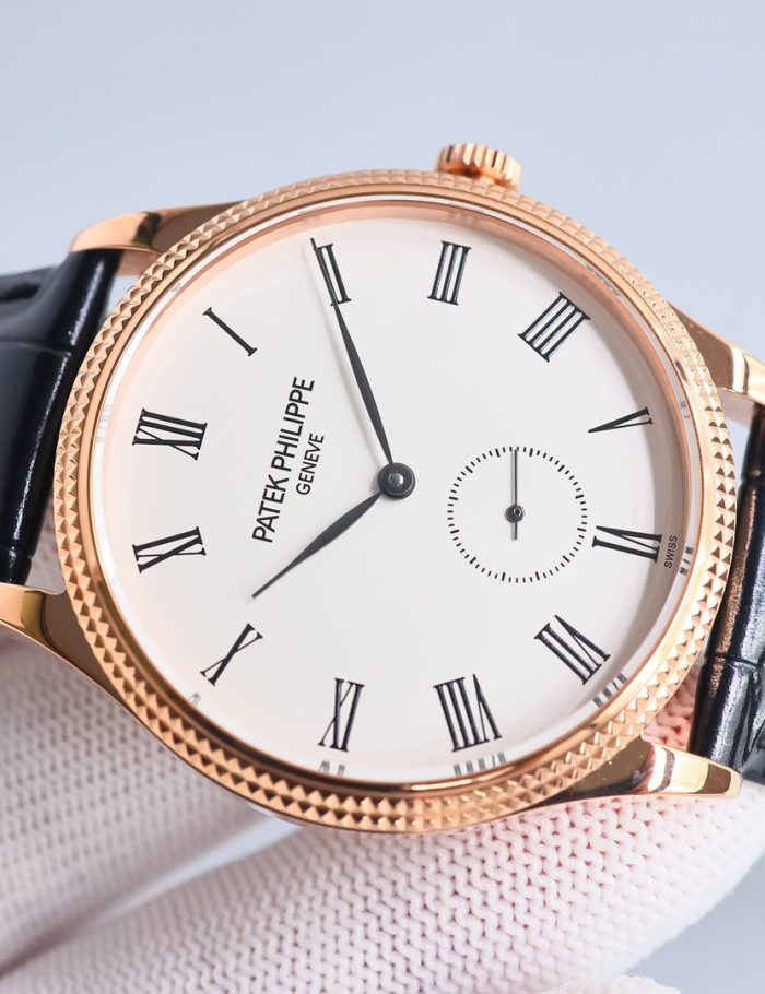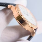 This Patek Philippe timepiece boasts a refined blend of elegance and craftsmanship. The gold case is paired with a sleek black leather strap, exuding timeless sophistication. Featuring a minimalist white dial with bold Roman numerals, it is perfect for both formal and business occasions. Crafted with premium materials, this watch symbolizes luxury and precision, ideal for those who appreciate classic style and impeccable quality.
