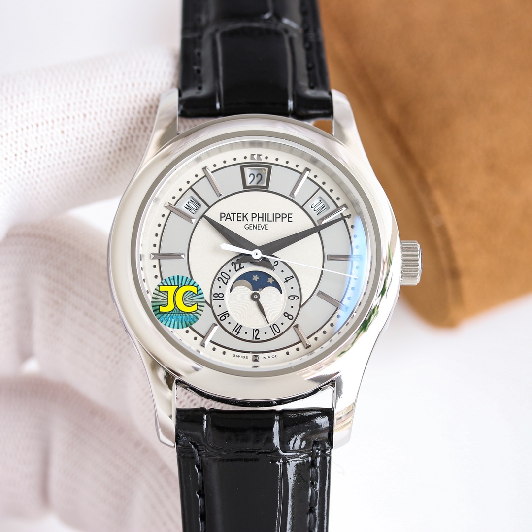 This Patek Philippe timepiece blends sophisticated style and precision engineering. Featuring a sleek black dial with elegant silver-tone markers, the watch is encased in polished stainless steel. Its black leather strap enhances its timeless appeal, making it suitable for both professional and formal occasions. The watch offers additional functionalities including date and moon phase indicators, embodying the brand’s commitment to craftsmanship and innovation.