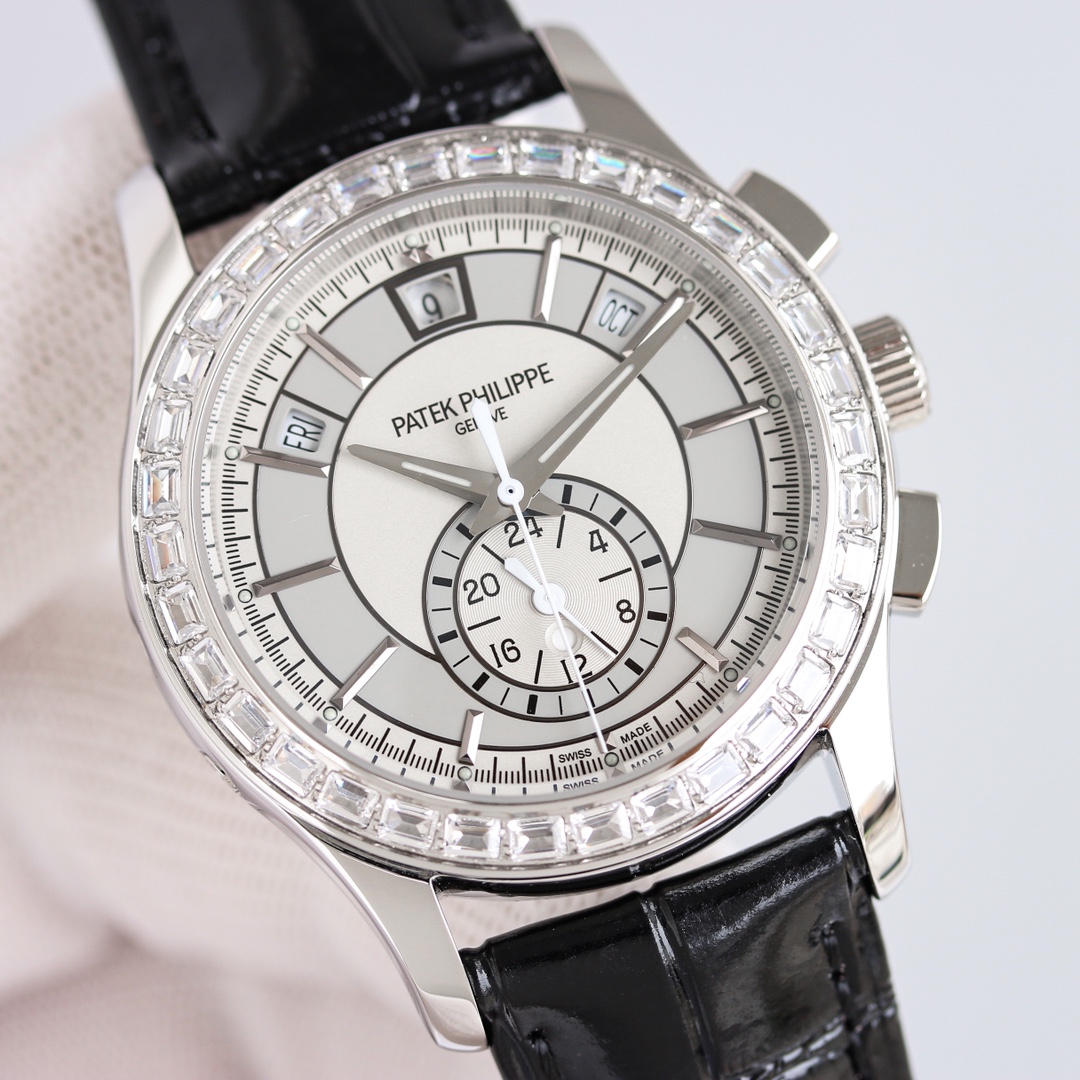 Discover timeless elegance with the Patek Philippe Luxury Chronograph Watch. This exquisite timepiece features a meticulously crafted silver dial encased in a polished stainless steel body, adorned with a bezel of sparkling diamonds. The black leather strap adds a touch of sophistication, making it perfect for both formal and casual occasions. Ideal for those who appreciate precision, luxury, and style.