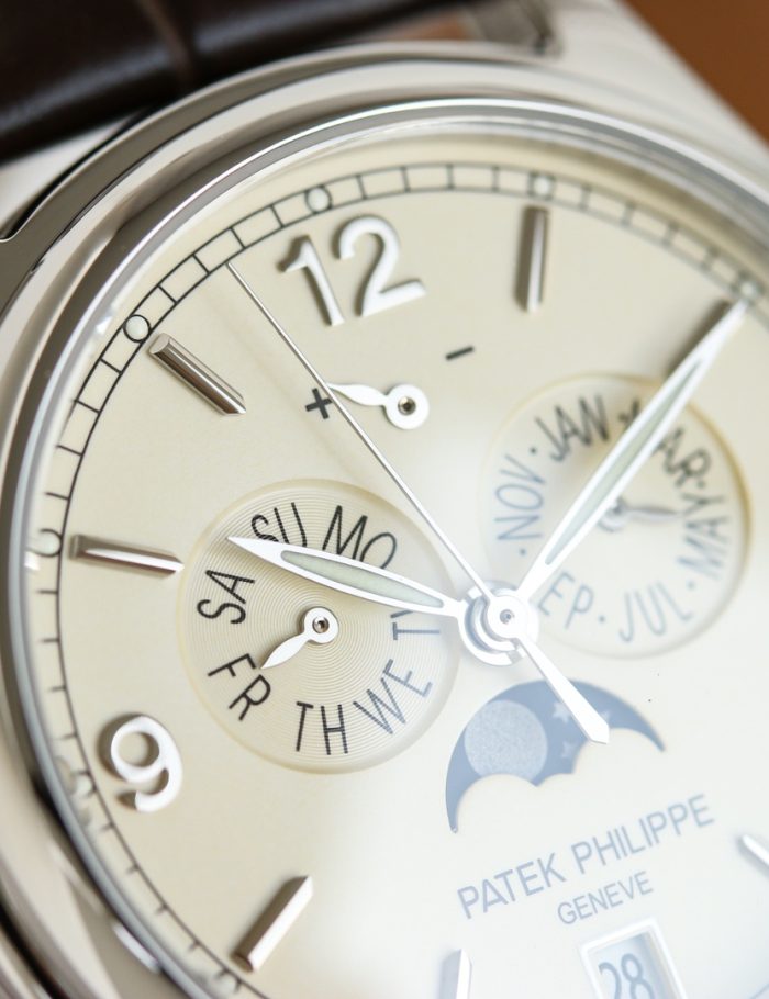 This exquisite Patek Philippe watch features a sophisticated perpetual calendar with moon phases. Crafted with a stainless steel case and a classic brown leather strap, it exudes timeless elegance. Ideal for formal occasions, this watch is a testament to refined craftsmanship and luxurious style.
