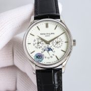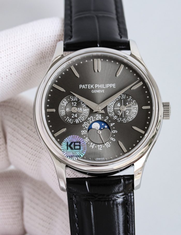 Experience timeless elegance with the Patek Philippe Men’s Complications Watch. Featuring a classic white dial with intricate perpetual calendar functions, this watch is a statement of sophistication. Encased in polished stainless steel and paired with a sleek black leather strap, it seamlessly blends luxury with precision. Perfect for formal events or as a collector’s piece, it’s an embodiment of exquisite craftsmanship and style.