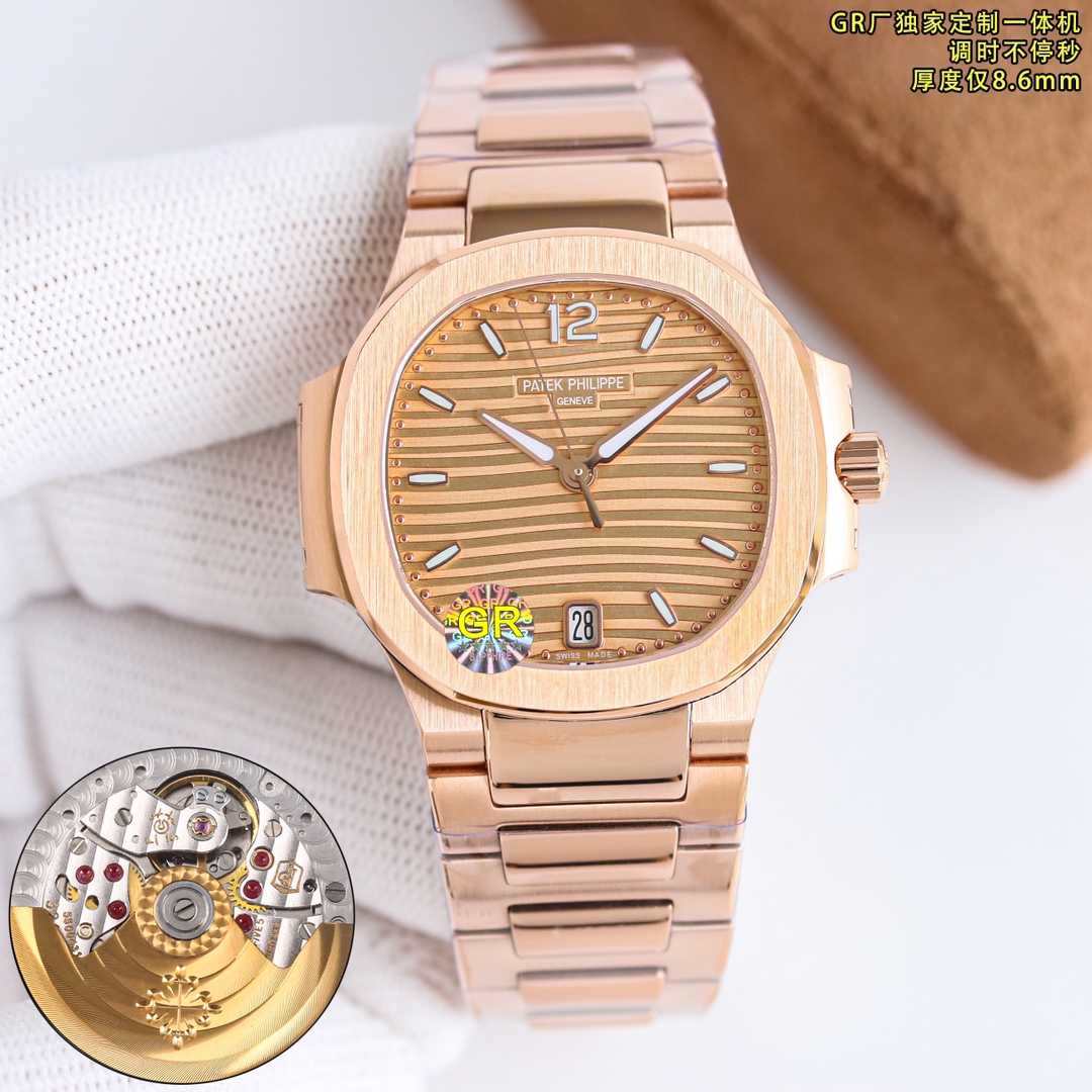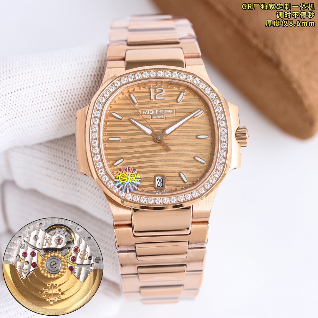 Elegant and timeless, the Patek Philippe Nautilus features a rose gold case adorned with sparkling diamonds, creating a luxurious allure. The olive-green dial with horizontal embossing highlights its modern aesthetic, while the integrated rose gold bracelet ensures a seamless look. Perfect for both formal and casual occasions, this watch embodies sophisticated style and impeccable craftsmanship.