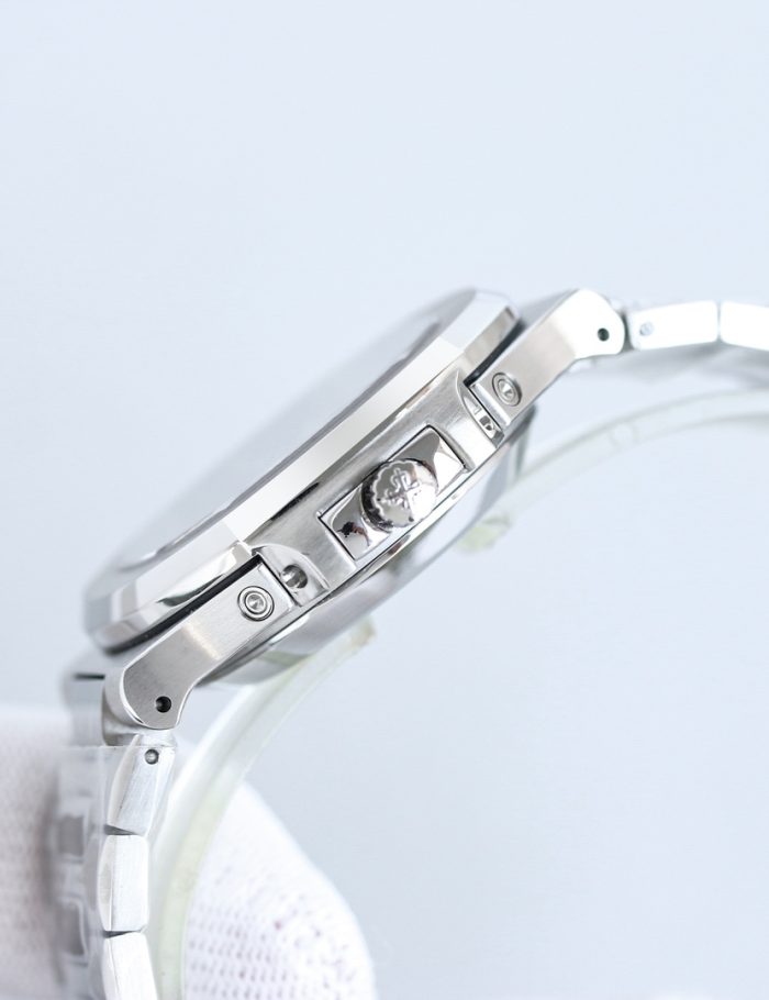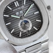 The Patek Philippe Nautilus boasts a sophisticated design with its iconic stainless steel case and bracelet. Featuring a sleek gray dial and luminescent hands, this timepiece exudes elegance and precision. Perfect for both formal and casual occasions, it combines luxury and functionality, offering a timeless style that suits any wardrobe.