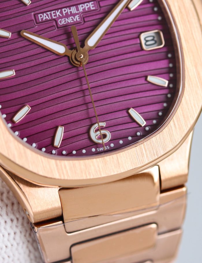 Discover timeless elegance with the Patek Philippe Rose Gold Nautilus. This exquisite timepiece features a striking purple dial with embossed texture, encased in luxurious rose gold. Its sophisticated design is complemented by a robust metal bracelet, making it suitable for both formal and casual occasions. Crafted with precision, this watch embodies Patek Philippe’s renowned craftsmanship and style.