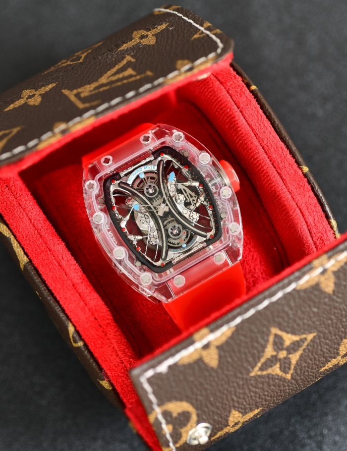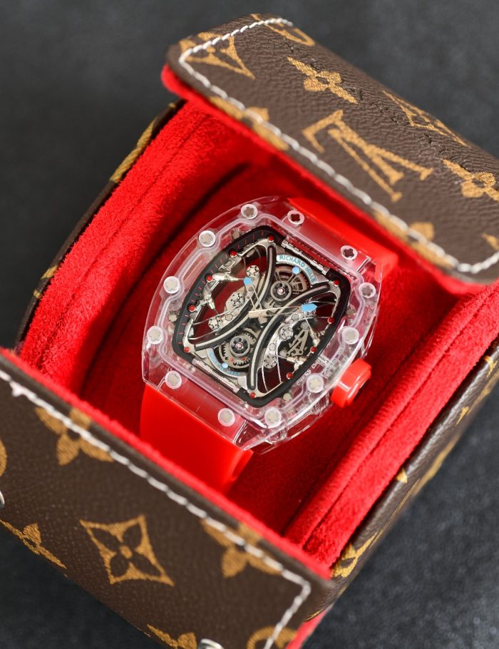 This sophisticated Richard Mille watch combines a striking transparent case with a vibrant red strap, offering a fusion of modern style and luxury. The intricate skeleton dial showcases exquisite craftsmanship, making it a statement piece for any watch aficionado. Designed with high-quality materials, the timepiece is perfect for both formal occasions and everyday wear, providing durability and elegance.