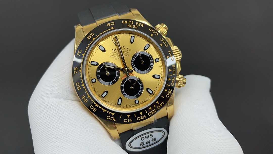 Experience luxury with the Rolex Cosmograph Daytona. This exquisite timepiece features a striking gold dial, black ceramic bezel, and a resilient rubber strap, exuding both elegance and durability. Designed for precision, it’s perfect for motorsport enthusiasts or anyone who values impeccable craftsmanship. Upgrade your watch collection with this stylish and functional masterpiece.