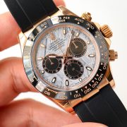 The Rolex Cosmograph Daytona combines sophistication with functionality. Crafted with an 18k rose gold case and a striking meteorite dial, this luxury sports watch exudes elegance and precision. Its black ceramic bezel and rubber strap enhance its durability and style, making it perfect for both professional and casual settings. Designed for those who appreciate fine craftsmanship and timeless design.