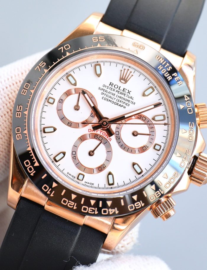 The Rolex Cosmograph Daytona is the epitome of luxury and precision. Featuring a stunning Everose gold case paired with a robust black Oysterflex bracelet, it seamlessly blends sophistication with sportiness. The watch’s tachymetric scale and chronograph functionality cater to racing enthusiasts and elegant timepiece collectors alike. Perfect for both formal occasions and active lifestyles.