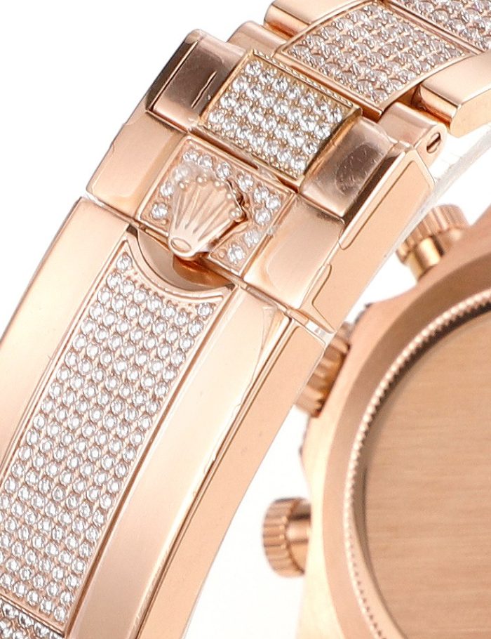 The Rolex Cosmograph Daytona exudes luxury with its exquisite rose gold construction and a vibrant, rainbow-colored gem-set bezel. This masterpiece combines precision and elegance, featuring a diamond-encrusted dial and bracelet. It’s perfect for both formal events and adding a statement piece to upscale attire. Embrace timeless style with Rolex’s renowned craftsmanship in this iconic timepiece.