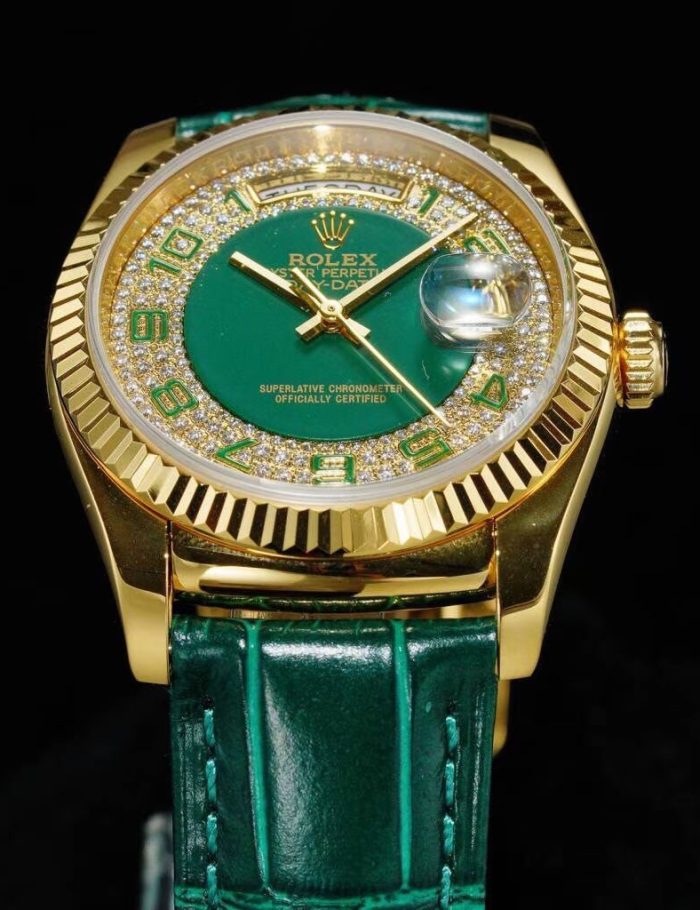 The Rolex Day-Date features a striking green dial adorned with diamond hour markers, set in a luxurious gold case. Paired with a sophisticated green leather strap, this timepiece epitomizes elegance and style. Crafted for those who appreciate both form and function, it’s a perfect accessory for formal occasions or everyday wear, showcasing Rolex’s commitment to precision and luxury craftsmanship.