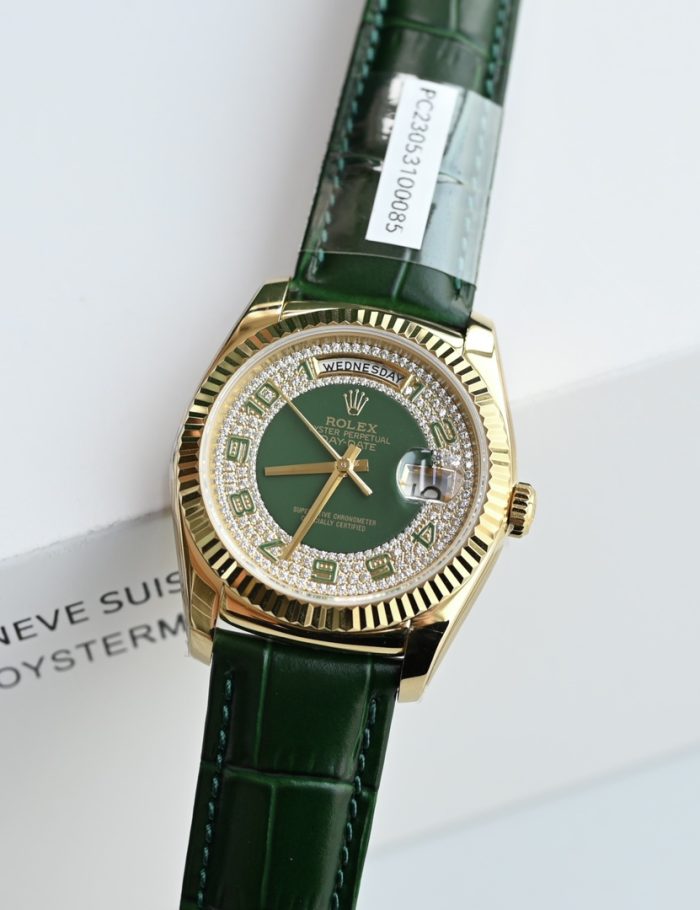 Experience luxury with the Rolex Day-Date, featuring a stunning green dial embellished with diamond hour markers. The watch is crafted with a gold case, offering a sophisticated look. Paired with an elegant green leather strap, this timepiece is perfect for formal occasions or making a statement in any setting. Designed for those who appreciate the finer things, it combines timeless style with impeccable craftsmanship.