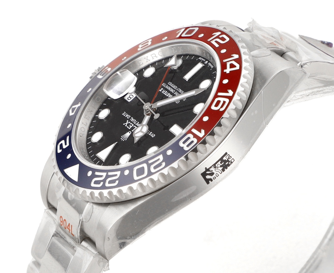 The Rolex GMT-Master II combines luxury with functionality, featuring a striking red and blue ceramic bezel and a robust stainless steel oyster bracelet. Its classic black dial with luminous markers is perfect for traveling professionals, ensuring readability in any time zone. Crafted from high-quality materials, this timepiece blends elegance and practicality for both casual and formal occasions.